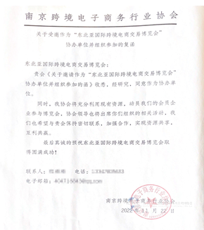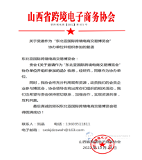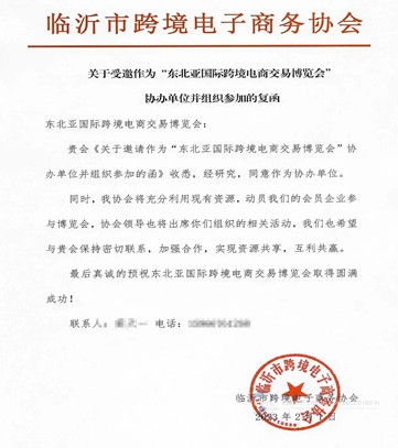 临沂市跨境电子商务协会正式回函给东北亚国际跨境电商交易博览会组委会,同意作为东北亚国际跨境电商交易博览会的协办单位,同期组委会将与临沂市跨境电子商务协会共同组织相关会议和高峰论坛,共同推动东北亚地区跨境电商行业快速发展,共同打造跨境电商行业···